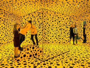 Yayoi Kusama was a Japanese artist who was a self-described “obsessional artist,” known for her extensive use of repetitive polka dots and for her infinity installations. She employed painting, sculpture, performance Art, and installations in a variety of styles, including Pop Art and Minimalism. This exhibition is at SFMOMA through Sept 7, 2024.