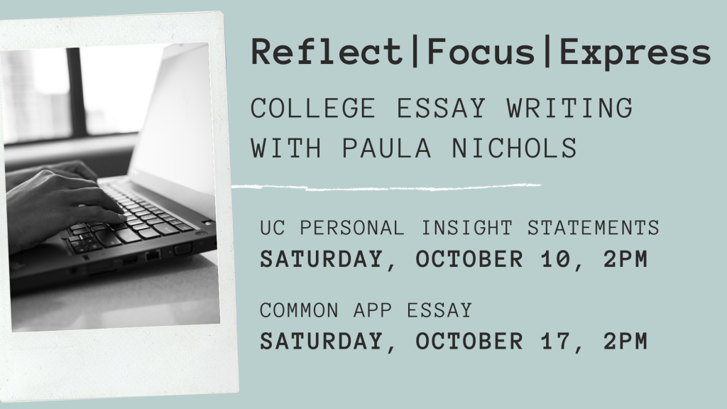 Paula Nichols has over 12 years of experience helping high school students “Reflect, Focus, and Express” in creating meaningful college essay narratives. She joins us again to offer her popular free information sessions for teens (and parents too)! Attend one or both.