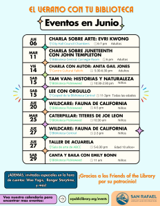 Para ofrecer más opciones a la comunidad mientras la Biblioteca del Centro está cerrada, vamos a ampliar las horas en todas las Bibliotecas Públicas de San Rafael. Consulte la extensión de nuestras horas de servicio aquí.