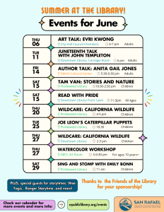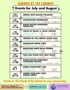 All San Rafael Public Library branches will be closed December 23 – January 4. The Pickleweed Library will be closed starting December 21st and will also reopen on January 4.